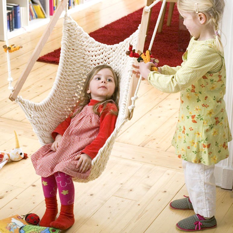 Spielerisch werden Wahrnehmung, Körper- und Gleichgewichtsgefühl gestärkt. Der Bewegungsfreiraum im Hängestuhl motiviert dazu, eigene Möglichkeiten zu entdecken. Ob als Traumreise Wolke, Rückzugsort zum Lesen oder Nest zum Kuscheln – der Kreativität sind keine Grenzen gesetzt. Auf Tuchfühlung mit dem angenehm weichen und anpassungsfähigen Naturmaterialien erleben Kinder ein intensives, ganzheitliches Körpergefühl. Die wechselnden Impulse der kreis-, pendel- oder spiralförmigen Schwingungen stimulieren.